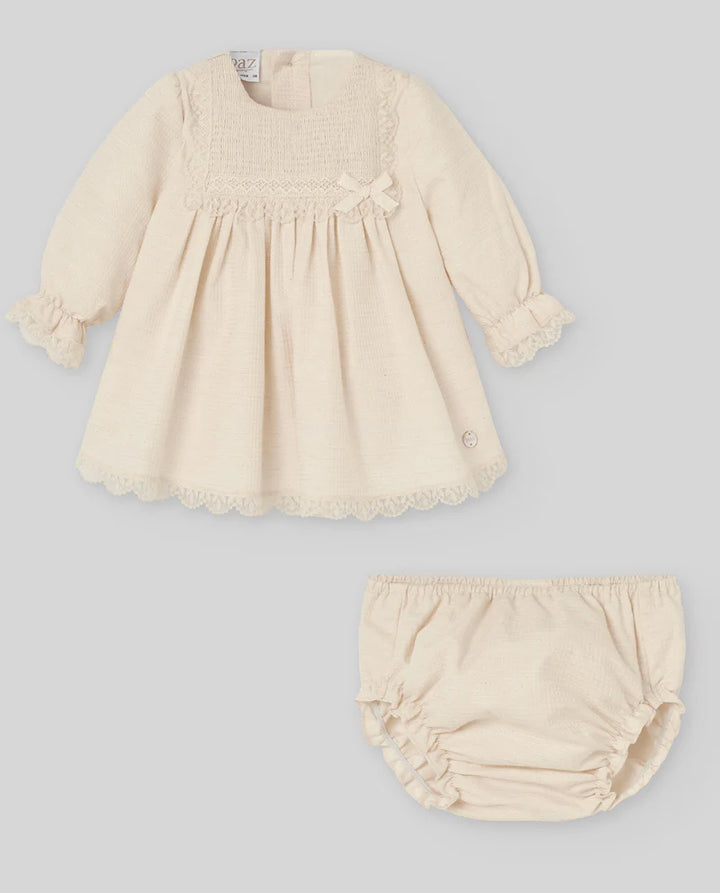 Questo elegante abito da cerimonia per neonata, realizzato in morbido cotone, garantisce il massimo comfort e delicatezza sulla pelle delicata dei più piccoli. Il design si distingue per il collo rotondo e le maniche lunghe a sbuffo, arricchite da un raffinato dettaglio a punto smock impreziosito da un delicato merletto. Completo di culotte abbinata, questo capo firmato dall’azienda spagnola PAZ RODRIGUEZ unisce stile e praticità per occasioni speciali.