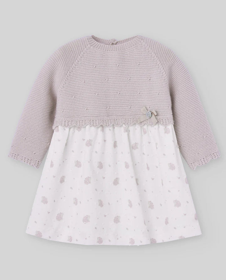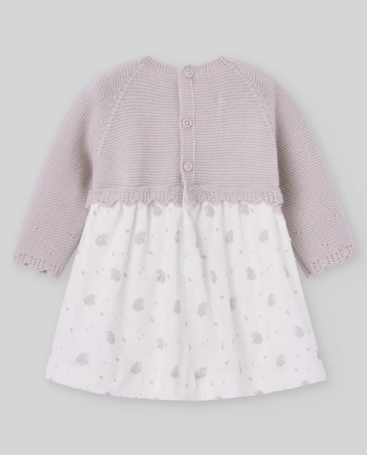 L'abito ERIZOS per neonata unisce la morbidezza della lana alla freschezza del cotone, garantendo comfort e calore. Il corpetto lavorato a maglia offre una texture raffinata, mentre la gonna in cotone con fantasia floreale all-over aggiunge un tocco di eleganza delicata. L'abbottonatura posteriore con bottoni in madreperla facilita la vestizione, unendo praticità e dettaglio prezioso. Firmato PAZ RODRIGUEZ, è ideale per vestire con stile e cura nei primi mesi di vita.