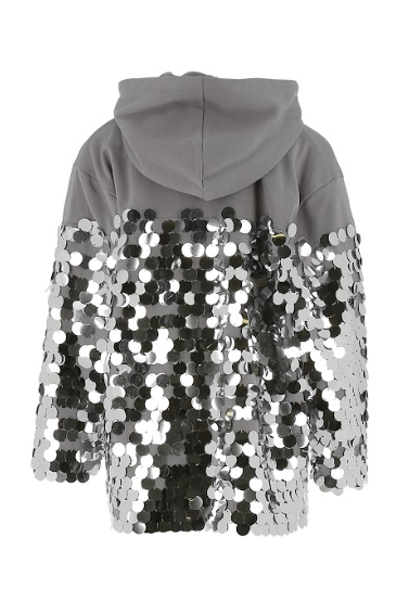 Questo abito da bambina firmato PINKO unisce comfort e stile grazie alla morbida felpa che garantisce praticità e calore. Il cappuccio aggiunge una protezione versatile, mentre la manica lunga ed ampia dona un tocco di originalità e movimento. La superficie interamente rivestita di maxi paillettes cattura la luce e conferisce al capo un aspetto brillante, perfetto per momenti speciali senza rinunciare alla comodità quotidiana.