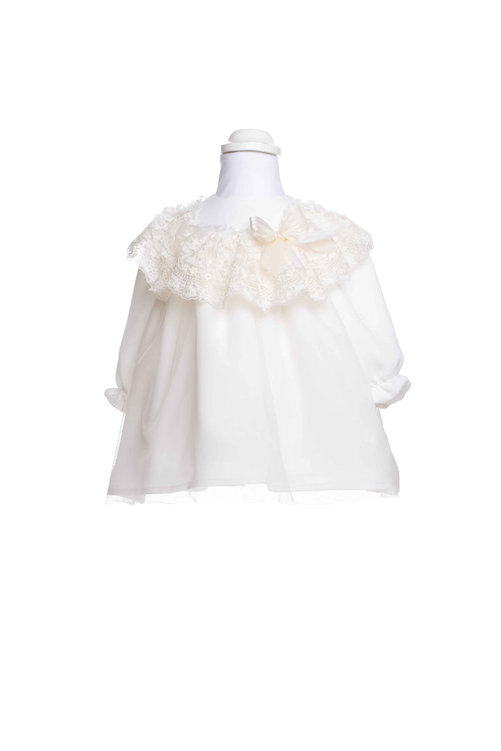 Questo abito da neonata SISSI M/L è perfetto per cerimonie e battesimi, realizzato in Italia con materiali di alta qualità. La manica lunga e il delicato colletto in pizzo offrono un'eleganza sobria e raffinata, ideale per vestire la tua piccola con stile e comfort in occasioni speciali.