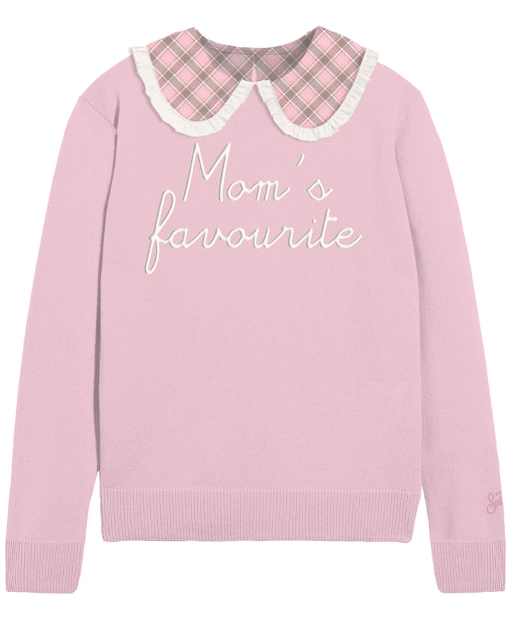 Delicato maglioncino in lana per bambina che unisce comfort e stile. Caratterizzato dal classico colletto alla Peter Pan con motivo tartan, l'indumento presenta un orlo rifinito con eleganti ruches e un ricamo "MOM'S FAVORITE" che aggiunge un tocco affettuoso. La lana morbida garantisce calore e morbidezza sulla pelle delicata. Un capo versatile firmato Saint Barth, perfetto per occasioni speciali o per il guardaroba quotidiano della piccola.