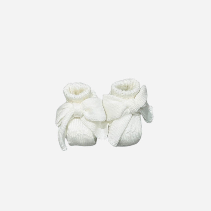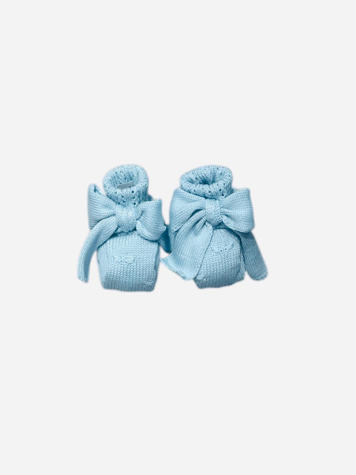 Realizzate in morbida e calda maglia, le babbucce ACQUAMARINA garantiscono comfort e calore ideale per l’uscita dalla clinica. La lavorazione traforata conferisce un tocco di delicatezza, mentre il fiocco in maglia aggiunge un dettaglio raffinato e coordinato. Prodotto da MARLU', combina eleganza e funzionalità per i primi giorni del neonato.