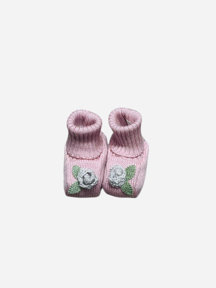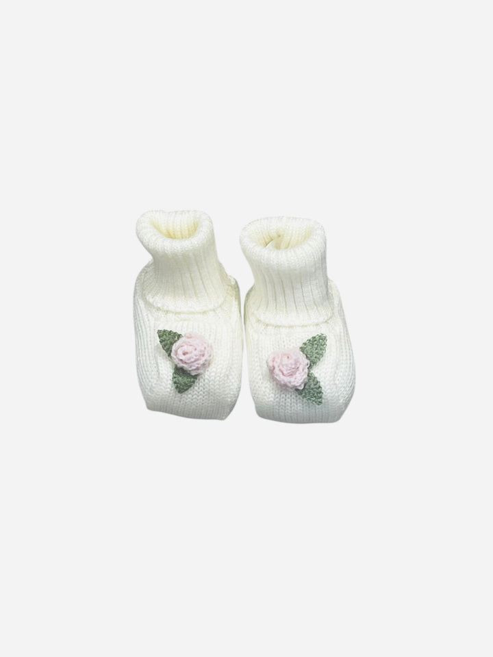 Le babbucce LOVE sono realizzate in morbida maglia calda, perfette per la prima uscita dalla clinica. Presentano raffinati dettagli di fiori lavorati a maglia sulla punta, che donano un tocco di delicatezza e stile. Progettate da MARLU', fanno parte del pregiato Corredino LOVE, sinonimo di qualità e attenzione al comfort del neonato.