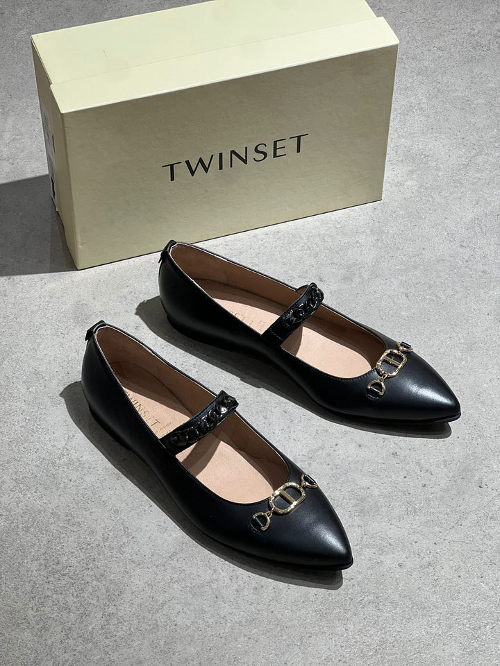 Ballerina in pelle pregiata per bambina con dettagli catena che conferiscono un tocco di eleganza sofisticato. Le applicazioni a punta a punta creano un design ricercato, perfetto per occasioni speciali o per chi desidera un accessorio che unisce comfort e stile. La costruzione in pelle garantisce durabilità e una vestibilità confortevole durante tutto il giorno. Un capo TWINSET che riflette qualità artigianale e attenzione ai particolari.