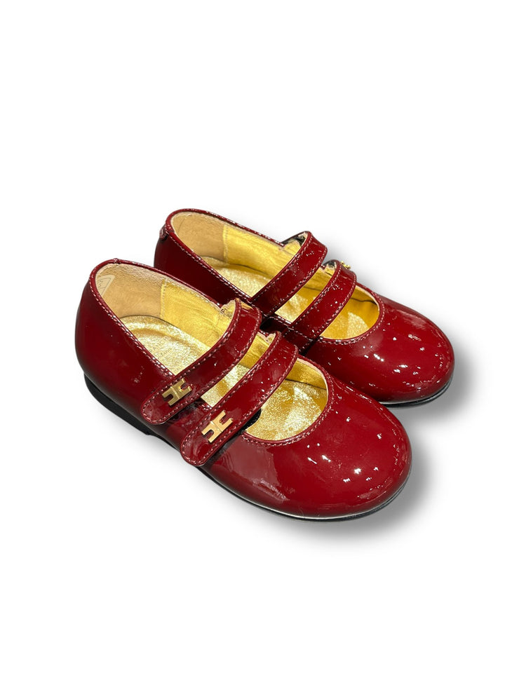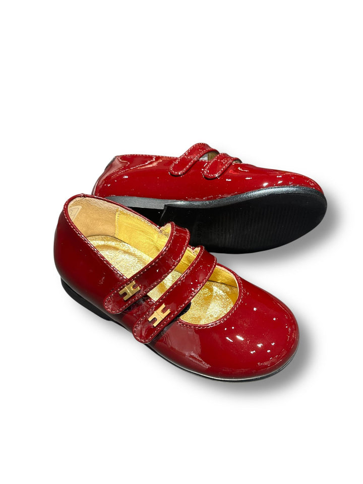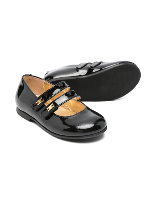 La ballerina Zuzi di Elisabetta Franchi, realizzata in Italia con pelle di vitello verniciata, unisce eleganza e comfort per la neonata. Il design sofisticato presenta doppia bretella e dettagli color oro che aggiungono un tocco raffinato, mentre la punta tonda e la suola piatta garantiscono una calzata sicura e comoda fin dai primi passi.