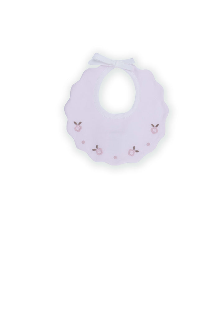 La bavetta SORAYA, realizzata in morbido cotone, presenta un orlo a smerlo rifinito con cura e un delicato ricamo a mano di fiori dolci e raffinati. Questo accessorio, prodotto da MARLU' e coordinato con la linea Corredino SORAYA, garantisce comfort e una qualità superiore per la cura quotidiana della neonata, unendo funzionalità ed eleganza in ogni dettaglio.