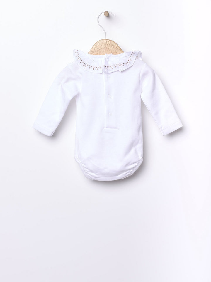 Il body SWEET DREAM per neonato è realizzato in morbida maglia di cotone leggero, ideale per garantire comfort e traspirabilità sulla pelle delicata del bambino. Il colletto con volant ricamato dona un tocco di eleganza, mentre la chiusura con bottoni automatici sul retro e tra le gambe facilita la vestizione e il cambio in modo pratico e sicuro. Un capo funzionale e raffinato, pensato per il benessere del tuo piccolo.