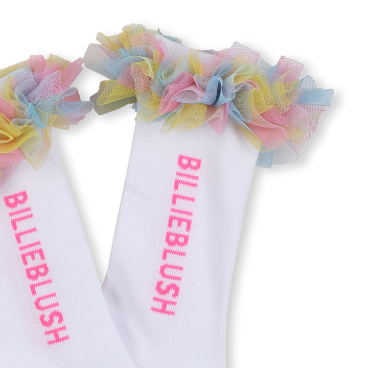 Aggiungi un tocco di allegria e stile agli outfit dei più piccoli con i calzini CONFETI di BILLIEBLUSH. Realizzati in maglia traforata multicolore con volant medio-alti, questi calzini offrono un effetto visivo originale e vivace. Il jacquard con logo e la finitura a coste garantiscono una vestibilità confortevole, mentre il design ricercato esalta ogni look con un dettaglio unico e di tendenza. Perfetti per completare con fantasia e personalità ogni abbigliamento bambina.