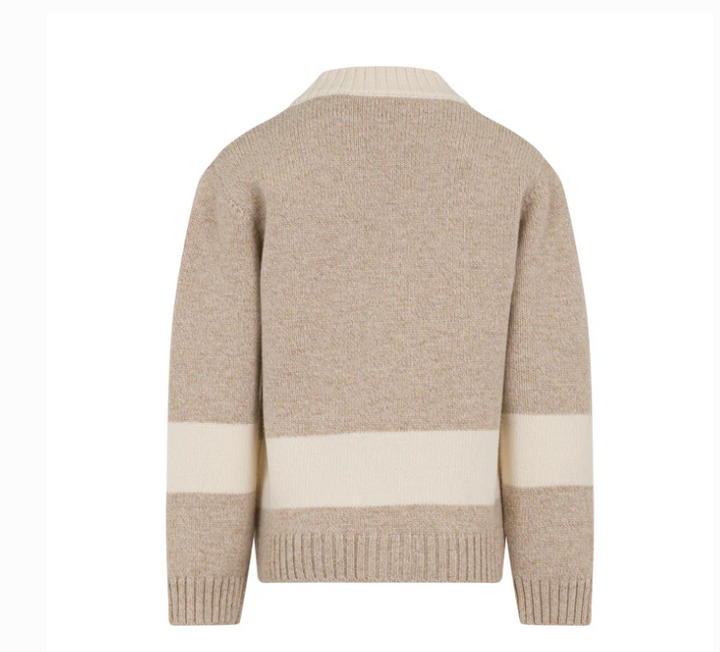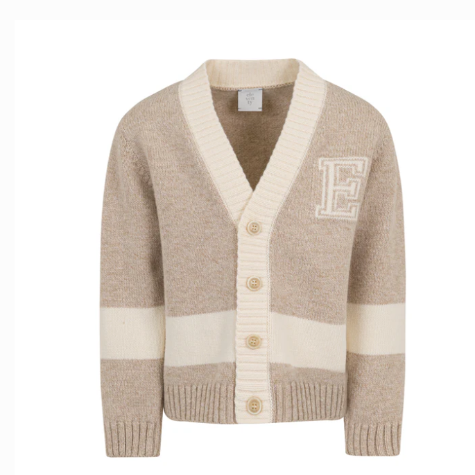 Questo cardigan da bambino in stile college, firmato ELEVENTY, unisce eleganza e comfort. Realizzato in morbida lana 100%, la sua tonalità beige con raffinati inserti a contrasto avorio dona un tocco di classe discreta. Perfetto per mantenere il piccolo al caldo con uno stile sofisticato e senza tempo.