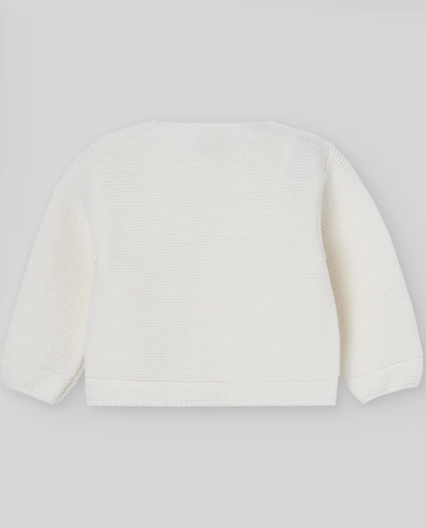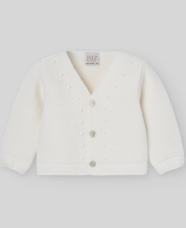 Il cardigan ESSENCIAL di PAZ RODRIGUEZ è ideale per completare il guardaroba del neonato con eleganza e comfort. Realizzato con chiusura frontale a tre bottoni in madreperla, presenta un delicato dettaglio a pallini e un collo a V, che garantiscono stile e praticità. Perfetto per diverse occasioni, assicura morbidezza e vestibilità ottimale.