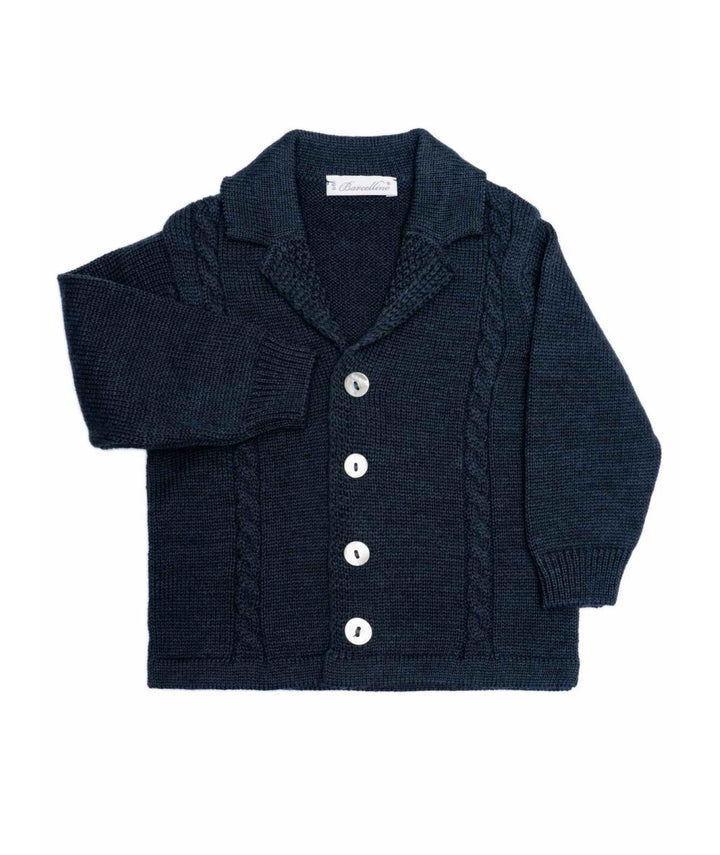 Questo cardigan intrecciato blu, caratterizzato da un motivo a treccia raffinato, unisce eleganza e comfort. Dotato di quattro bottoni e collo a giacca, offre una vestibilità versatile e uno stile sobrio ma distintivo, perfetto per un look curato in ogni occasione. Realizzato in maglia di qualità, assicura calore e resistenza.