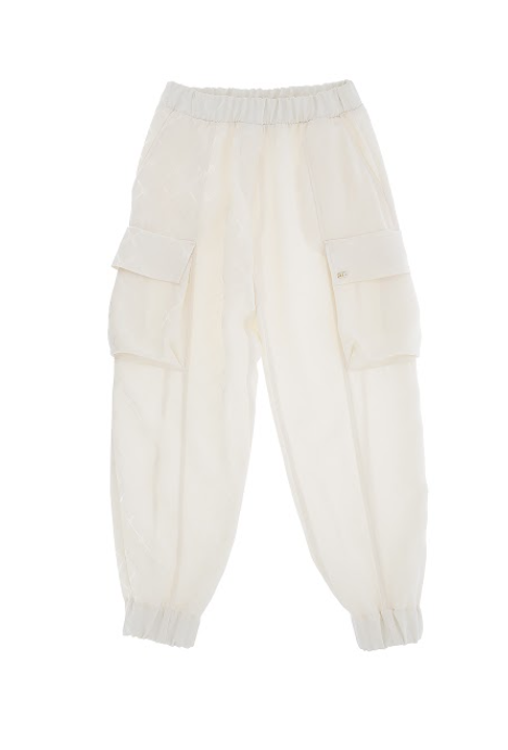 Pantalone da bambina in seta morbida con taglio over, dotato di elastici in vita e alle caviglie per una vestibilità elegante e confortevole. Il design è arricchito da pratiche tasche cargo e dal logo ELISABETTA FRANCHI jacquard stampato all-over, che conferisce un tocco di raffinatezza discreta e moderna. Ideale per un look sofisticato e di classe.