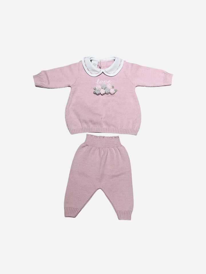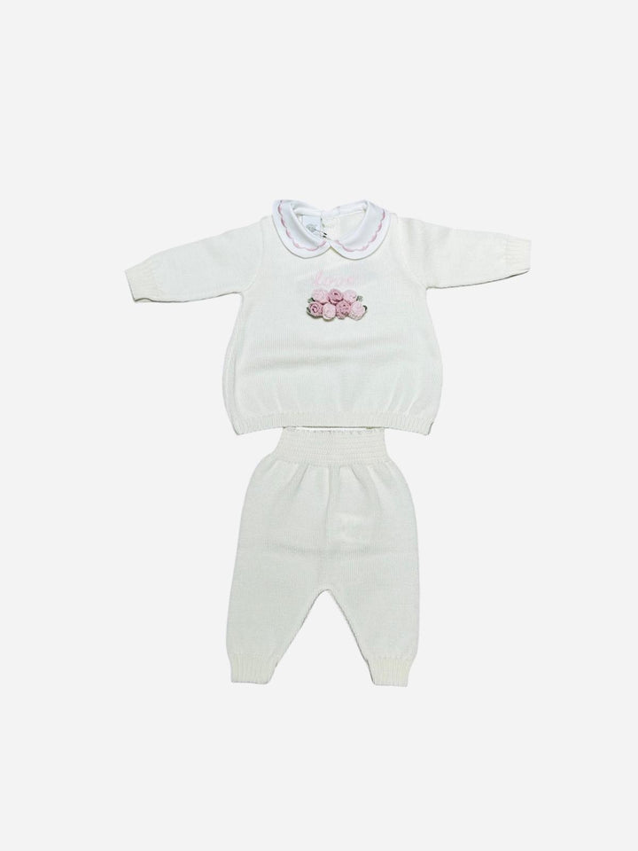 Il completo da neonata "LOVE" è realizzato in morbida e calda maglia, combinando cashmere e cotone per un comfort superiore. Il maglioncino presenta un colletto modello Peter Pan e si distingue per i delicati ricami con la scritta "LOVE" e le raffinate applicazioni floreali. Il pantalone coordinato, anch’esso in maglia, completa il completo offrendo un capo elegante e confortevole, ideale per proteggere e coccolare la tua piccola con stile.