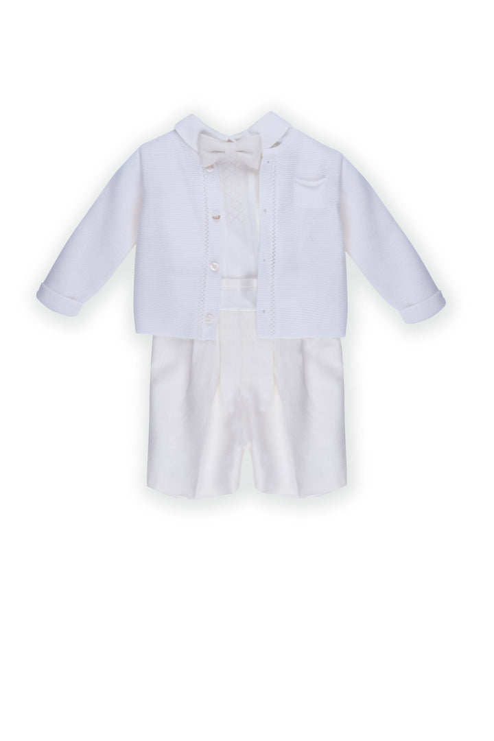 Questo completo da battesimo VANIGLIA, realizzato interamente in Italia con materiali di alta qualità, garantisce comfort e eleganza fin dai primi giorni. Composto da cardigan, camicia con papillon e pantalone, è confezionato in lana 100%, perfetto per mantenere il neonato caldo e raffinato durante le cerimonie più importanti. Un capo esclusivo pensato per celebrare momenti unici con stile e delicatezza.