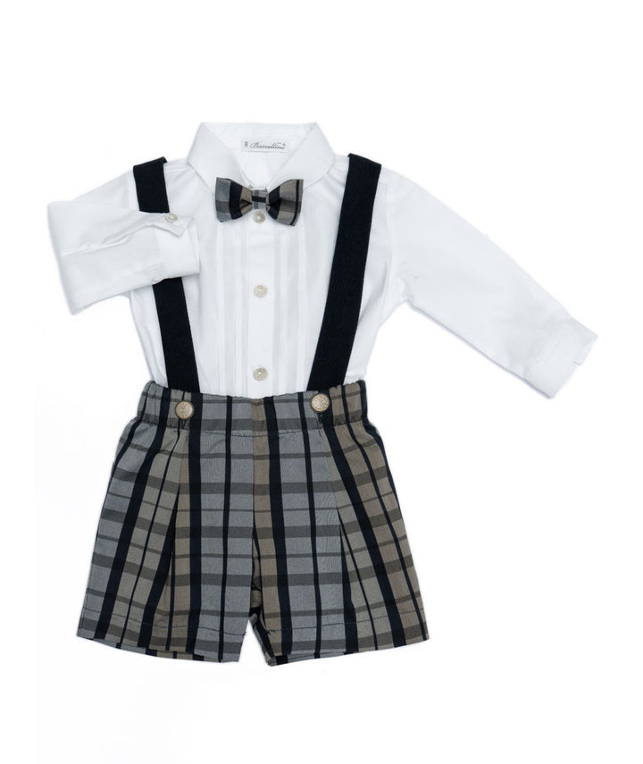 Questo coordinato elegante include pantaloni corti con bretelle a quadrettoni, una camicia bianca a body e un papillon coordinato, offrendo un look sofisticato e pratico. Ideale per occasioni speciali, garantisce comfort e stile raffinato grazie ai dettagli curati e alla combinazione armoniosa dei tessuti.