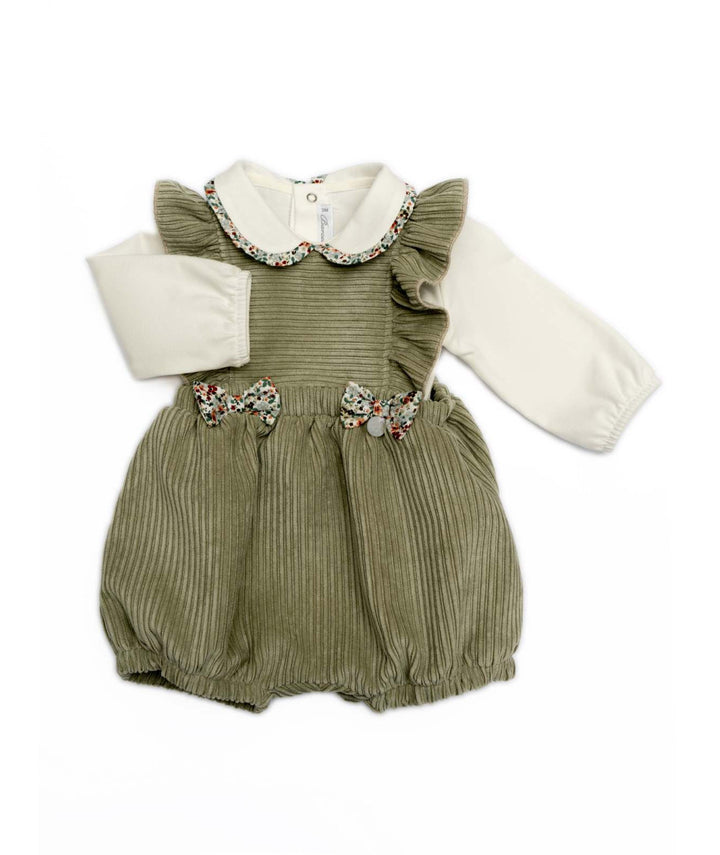 Questo coordinato autunnale per neonata di BARCELLINO unisce eleganza e comfort. Il body in cotone a manica lunga presenta un delicato collo alla Peter Pan rifinito da un orlo floreale, mentre il pagliaccetto in morbido velluto a coste offre calore e morbidezza. I fiocchetti in vita richiamano il motivo del colletto, creando un insieme armonioso e curato, ideale per i primi mesi di vita nei mesi più freschi.