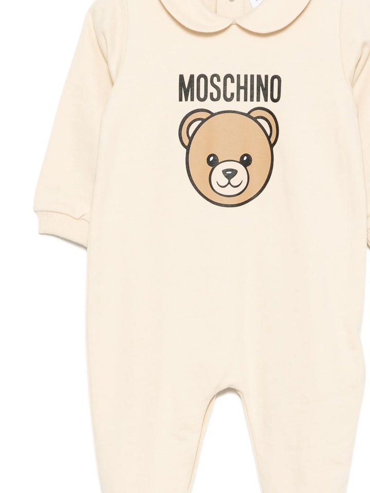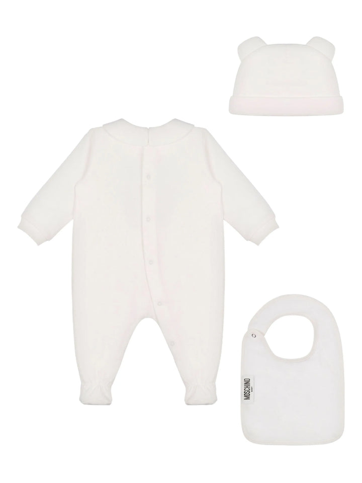 Questo coordinato neonato unisex firmato MOSCHINO unisce eleganza e comodità. Realizzato in morbido cotone, include una tutina con colletto alla Peter Pan e la stampa distintiva MOSCHINO, completata da bavetta e berretto coordinati. Perfetto per l’uscita dalla clinica, garantisce un primo abbigliamento raffinato e delicato.