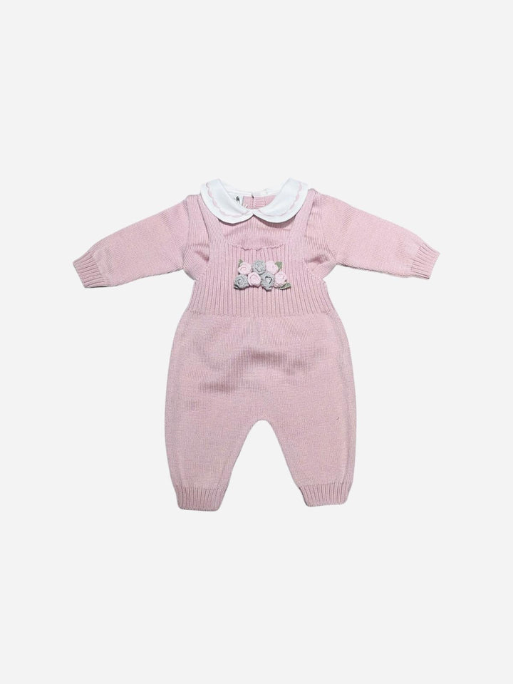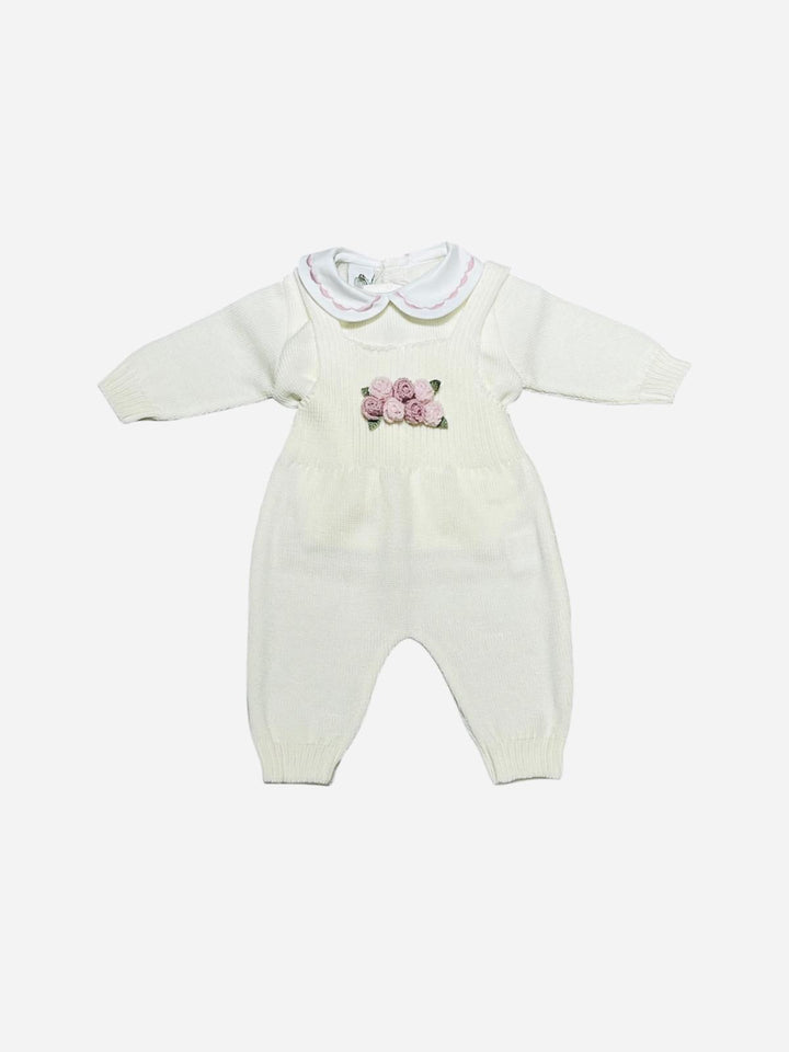 Questo coordinato per neonata, realizzato da MARLU', è ideale per l'uscita dalla clinica. Il maglioncino in morbido cashmere e cotone presenta un delicato colletto modello Peter Pan, mentre la salopette in maglia è arricchita da raffinati fiorellini ricamati. La combinazione assicura comfort e calore, offrendo allo stesso tempo uno stile elegante e appropriato per i primi giorni di vita. Perfetto da abbinare al corredino LOVE per un completo armonioso e curato nei dettagli.