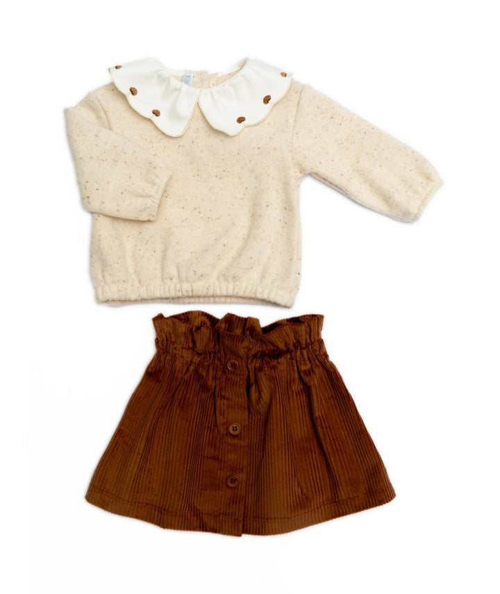 Il coordinato MUSHROOM di BARCELLINO unisce eleganza e comodità per la neonata. Il maglioncino, realizzato in morbido cotone, presenta un delicato collo con orlo a smerlo e un raffinato dettaglio ricamato, mentre la gonna in velluto a coste dona calore e uno stile autentico, arricchita da una pratica abbottonatura frontale. Perfetto per avvolgere la tua piccola in un look sofisticato e confortevole.