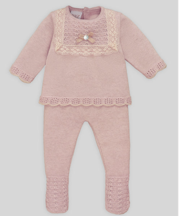 Il Coordinato PASCUA di PAZ RODRIGUEZ è pensato per l’uscita dalla clinica, garantendo comfort e protezione alla neonata. Realizzato in morbida miscela di cotone e cashmere, la maglia a maniche lunghe presenta trafori decorativi, colletto in pizzo ricamato con volant e bottoni raffinati. Le finiture ondulate su bordo e polsini aggiungono un tocco di eleganza delicata. Le ghettine abbinate, con piedino cucito, assicurano calore e protezione durante l’inverno. Un coordinato raffinato che unisce qualità e cura nei dettagli.