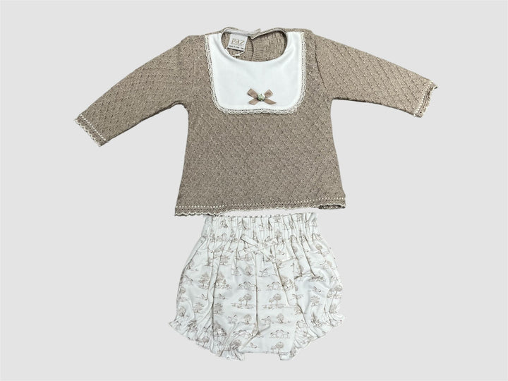 Questo coordinato da neonata, firmato dall'azienda spagnola PAZ RODRIGUEZ, unisce eleganza e comfort. Il maglioncino in morbido filo di lana lavorato a ferri presenta un raffinato bavero quadrato impreziosito da un logo in madreperla. La culotte in cotone, con una delicata stampa all-over di pony, completa il look garantendo morbidezza e libertà di movimento. Perfetto per le prime uscite della tua piccola con stile e praticità.