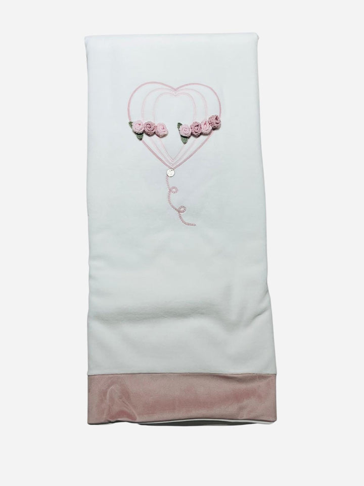Realizzata da MARLU', la coperta ANASTACIA unisce morbidezza e calore grazie al cotone caldo e alla ciniglia di alta qualità. Il delicato ricamo a cuore balloon e le applicazioni di fiori in maglia aggiungono un tocco raffinato, ideale per avvolgere la tua neonata con comfort e stile. Perfetta per le prime coccole, garantisce una sensazione piacevole e protettiva.