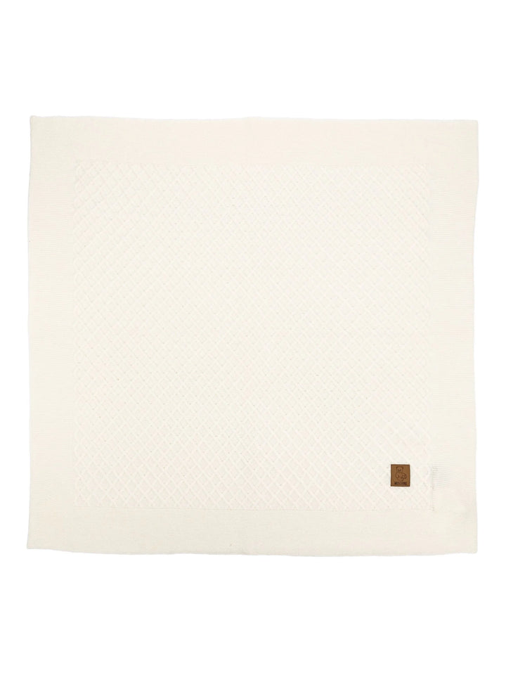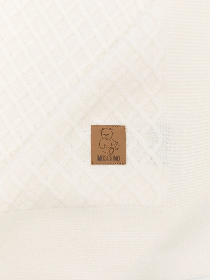 Questa coperta da neonato unisex, realizzata in morbida lana con elegante lavorazione intrecciata, garantisce comfort e calore delicato per la pelle del tuo bambino. Il dettaglio jacron con la stampa dell'iconico teddy Moschino aggiunge un tocco distintivo e raffinato. Perfetta per l’uscita dalla clinica, si abbina armoniosamente alla tutina e al berretto coordinati JACRON TEDDY, per un look curato e sofisticato fin dai primi momenti.
