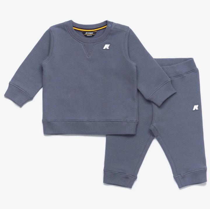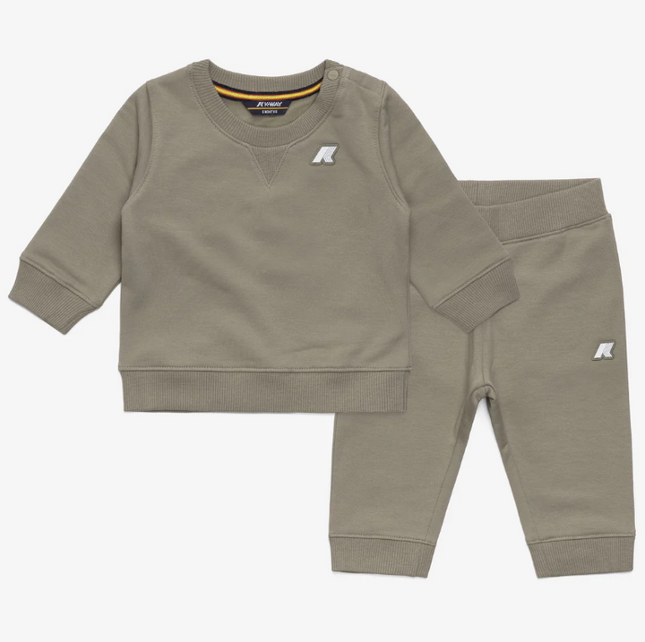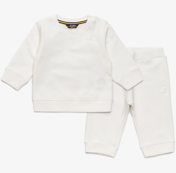 Questo set K-WAY per neonati e bambini fino a 2 anni combina la felpa girocollo Baptistelle e i pantaloni Mickette, entrambi realizzati in morbida felpa garzata di cotone. La felpa presenta sprone a punta, bottoncini di chiusura sulla spalla, polsini e bordo vita a costine per una vestibilità ottimale. I pantaloni con vita elasticizzata e fondo a costine assicurano comfort e facilità di movimento. Il logo in silicone bianco aggiunge un tocco distintivo, ideale per i più piccoli.