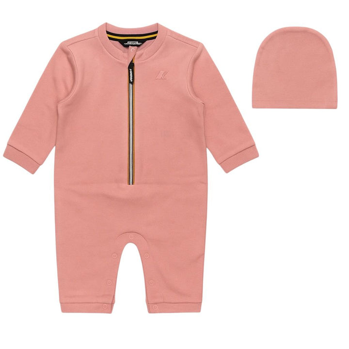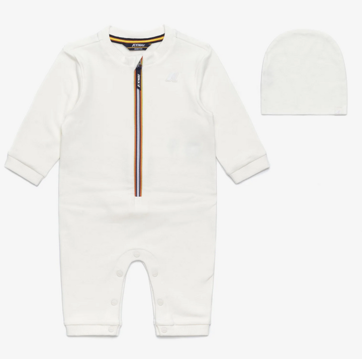 Il set E. Mille per neonati e bambini piccoli comprende una tutina e un cappellino, entrambi realizzati in morbido pile di cotone spazzolato. La tutina presenta maniche e gambe lunghe, bordi a costine e una chiusura con zip per garantire una vestibilità comoda e pratica. Il cappellino ha una forma semplice con un inserto logo K-Way sul bordo. La tutina è rifinita con un patch logo in silicone bianco, mentre il cappellino presenta una bandiera logo in silicone bianca, per un tocco raffinato e distintivo.
