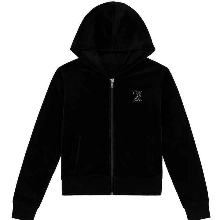 Felpa in velluto per bambina con chiusura frontale a zip e cappuccio, ideale per le giornate più fresche. Le maniche lunghe e gli orli a coste garantiscono una vestibilità comoda e duratura, mentre le pratiche tasche a marsupio offrono spazio per piccoli oggetti. Impreziosita dal logo decorativo, questa felpa combina stile e funzionalità per un look casual e raffinato.