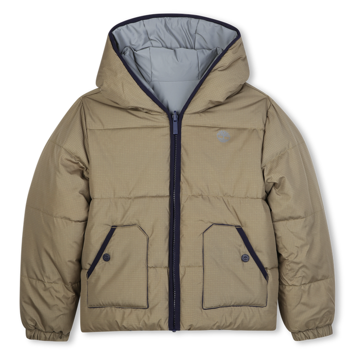 Il giubbotto reversibile Timberland unisce due look distinti in un unico capo versatile. Da un lato presenta una stampa testurizzata, dall’altro un tessuto lucido, adattandosi facilmente a diverse occasioni. Dotato di cappuccio e tasche funzionali, offre protezione dalla pioggia leggera senza rinunciare a uno stile contemporaneo e raffinato, con loghi posizionati con cura per un tocco distintivo.