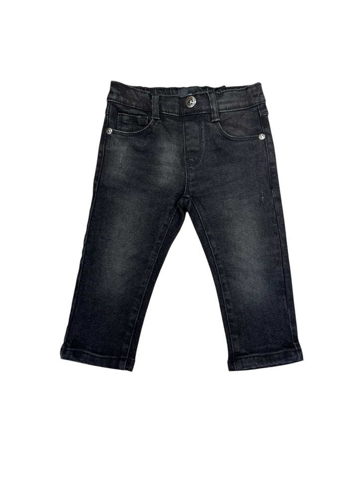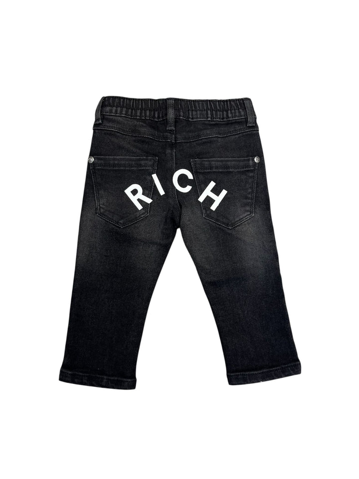 Jeans da neonato in morbido denim elasticizzato, con elastico in vita per una vestibilità comoda e sicura. Il modello presenta una stampa "RICTH" sul retro, dettaglio distintivo firmato JOHN RICHMOND, che unisce stile e praticità nei capi per i più piccoli.