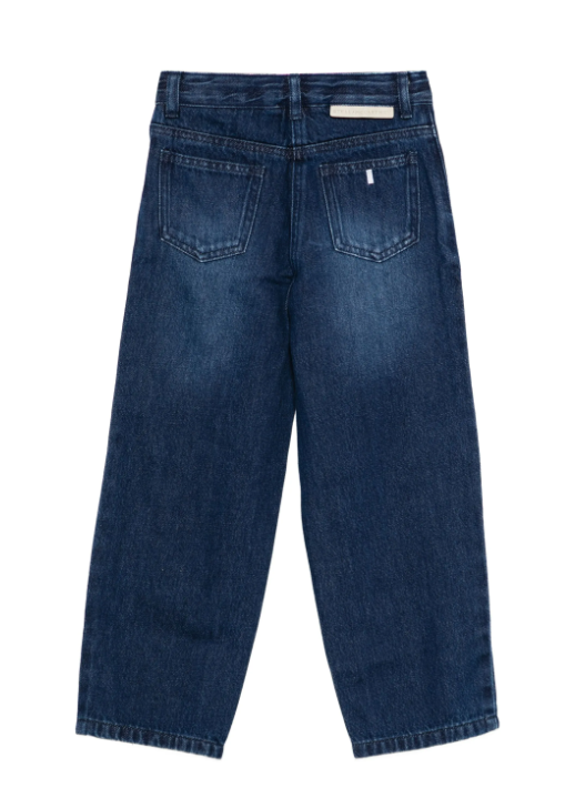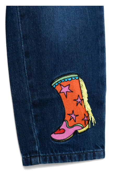 Jeans da bambina in denim elasticizzato con vestibilità mom fit, caratterizzati da un raffinato motivo a patch di scarpe multicolore distribuito su tutta la superficie. Un capo esclusivo firmato Stella McCartney, che unisce comfort e stile contemporaneo con un tocco artistico. Ideale per chi cerca un look sofisticato senza rinunciare alla praticità.