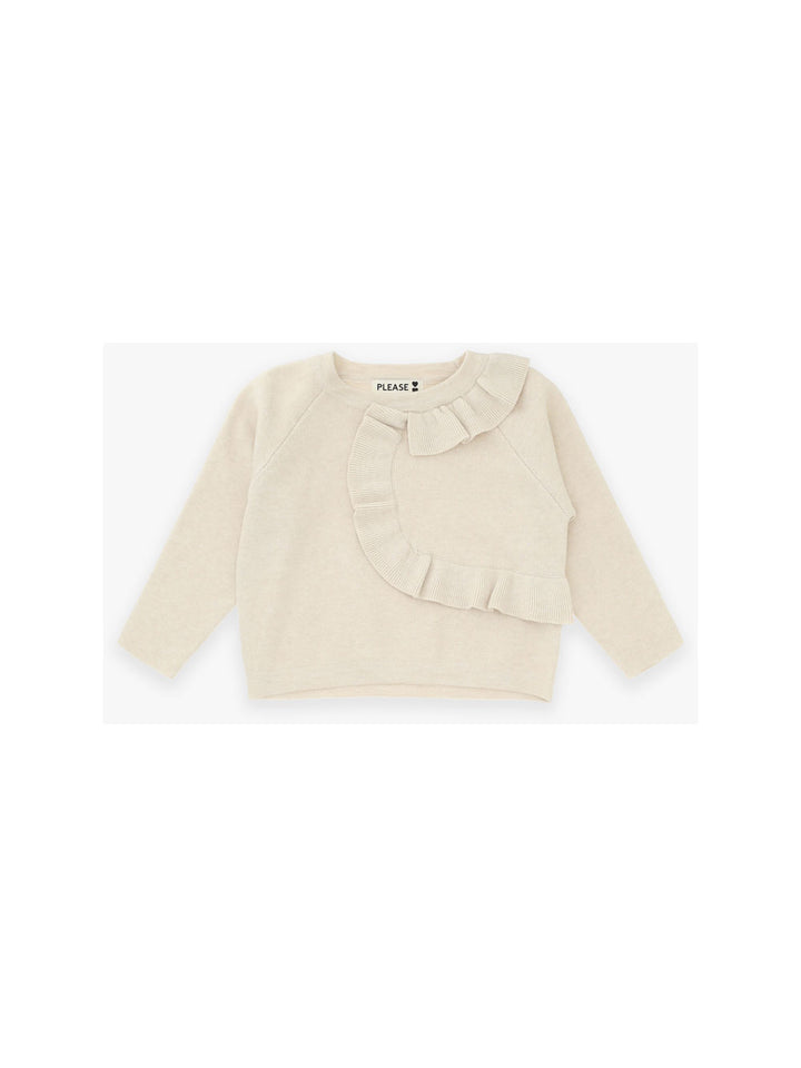 Maglia MARMO da neonata in morbida maglia che garantisce calore e comfort durante le stagioni fredde. Il capo presenta un elegante collo a coste che assicura una vestibilità stabile, maniche lunghe per una protezione completa e un raffinato dettaglio di ruches sul petto sinistro che aggiunge un tocco di eleganza. Realizzata da PLEASE, marchio rinomato per la qualità dei capi per l'infanzia, questa maglia combina praticità e stile, perfetta per il guardaroba essenziale della piccola.