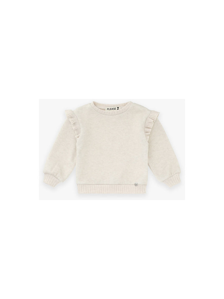 Delicato maglioncino in pura lana, ideale per le neonata durante i mesi più freddi. Il collo a coste si ripete elegantemente ai polsi e all'orlo, garantendo una vestibilità confortevole e contenitiva. Le maniche lunghe a sbuffo, decorate con volant raffinati, conferiscono un tocco di femminilità sofisticato. Realizzato da PLEASE con cura artigianale, si abbina perfettamente al Pantaloncino PERGAMENA per un look coordinato e ricercato.