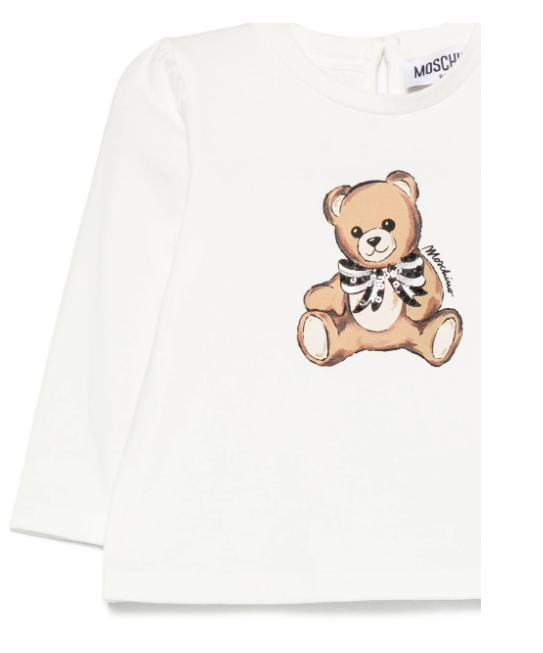 Questa maglia Moschino per neonata unisce eleganza e dolcezza con il suo caratteristico motivo Teddy Bear impreziosito da paillettes delicate. Realizzata con maniche lunghe e uno scollo rotondo, offre comfort e stile raffinato, perfetta per le occasioni speciali dei più piccoli.