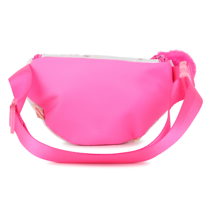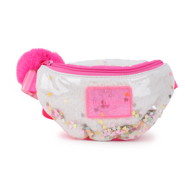 Il marsupio BILLIEBLUSH unisce funzionalità e design distintivo grazie al suo soffice pile ricoperto da cloruro di polivinile trasparente che custodisce paillettes a forma di cuore, creando un effetto luminoso e originale. Il dettaglio del pompon in pile e lo stemma del brand esaltano il carattere giocoso dell’accessorio. La tracolla regolabile con clip in plastica trasparente e la chiusura con cerniera assicurano comfort e praticità in ogni occasione.