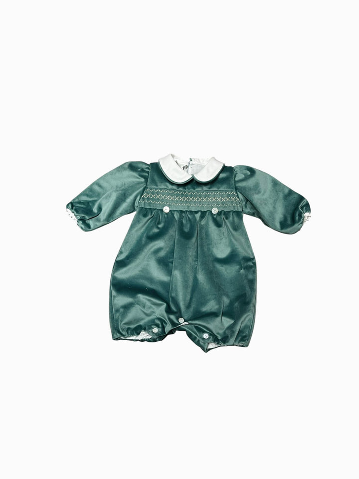 Il pagliaccetto ALCEO è realizzato in morbido velluto caldo, ideale per mantenere il neonato confortevole. Presenta un elegante collo modello Peter Pan e un corpetto a punto smock che aggiunge raffinatezza al capo. Gli elastici ai polsini garantiscono una vestibilità comoda, mentre l'abbottonatura sul retro e lungo la cavallo con bottoni in madreperla agevola il cambio del pannolino. Prodotto da MARLU', combina qualità e cura artigianale per vestire il tuo bambino con stile e praticità.