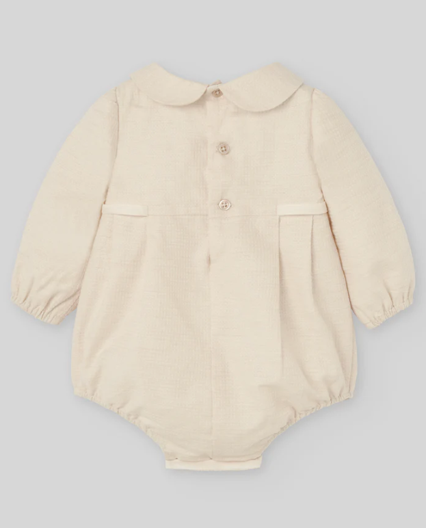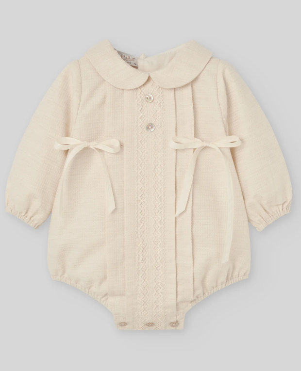 Il pagliaccetto ALEGRIA è realizzato in raffinato tessuto jacquard, perfetto per occasioni speciali come il battesimo. Il design elegante è arricchito da un colletto rotondo e delicati ricami, che conferiscono un tocco di classe. La chiusura con bottoni a pressione sul retro facilita la vestizione, garantendo comodità e praticità. Ideale per donare alla neonata uno stile sobrio e raffinato.