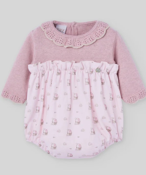 Il pagliaccetto PASCUA di PAZ RODRIGUEZ è realizzato in maglia e tessuto misto cotone-cashmere, garantendo morbidezza e comfort ideale per la pelle delicata della neonata. Il colletto decorativo e le arricciature donano un tocco elegante e raffinato, mentre la chiusura sul retro e sul cavallo facilita il cambio mantenendo praticità e sicurezza. Perfetto per i momenti speciali e l’uso quotidiano.