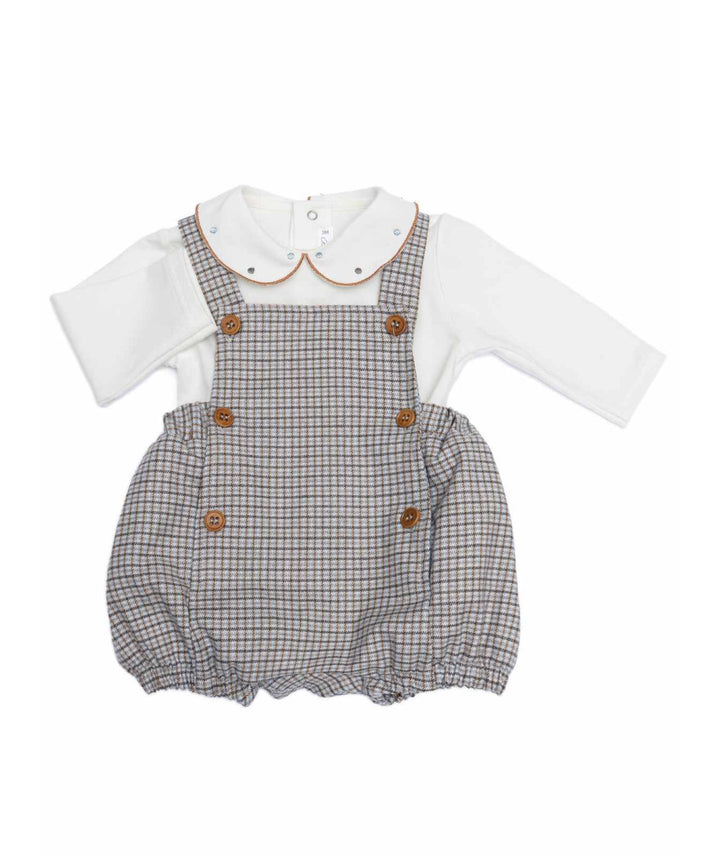 Il pagliaccetto POMONA di BARCELLINO combina comfort e stile per il neonato. Realizzato in morbido cotone, presenta una maglia a body con collo Peter Pan e pois ricamati, abbinata a una salopette pantaloncino con raffinata fantasia Pied de Poule. Un capo elegante e pratico, pensato per garantire il massimo benessere e una vestibilità perfetta ai più piccoli.
