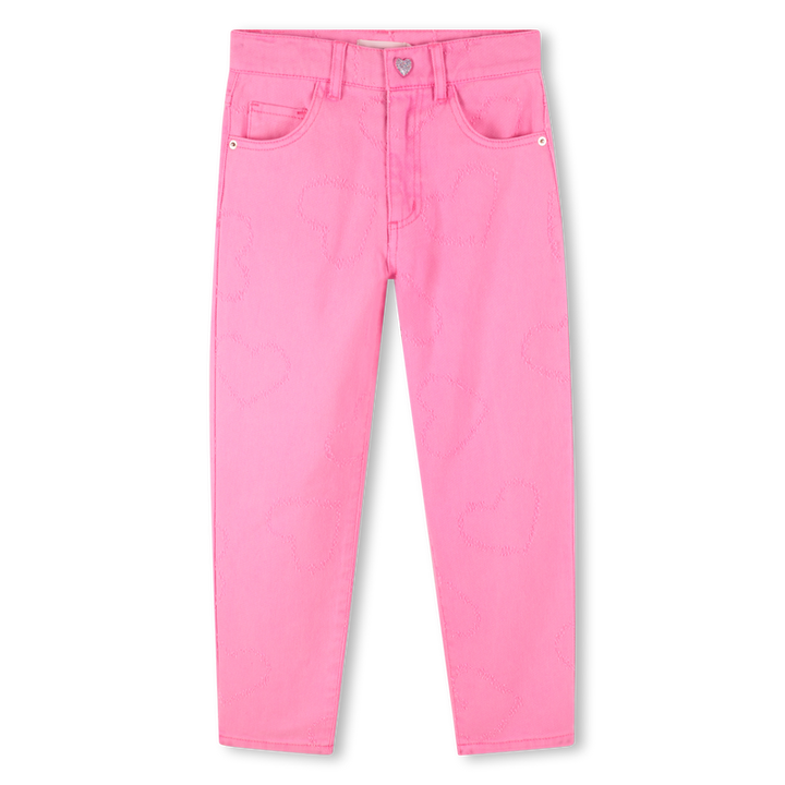 Questi pantaloni in twill combinano stile e funzionalità, perfetti per chi cerca un capo versatile e alla moda. La cintura regolabile e la chiusura con patta assicurano una vestibilità su misura, mentre le quattro tasche offrono praticità quotidiana. Decorati con piccoli cuori, esprimono un carattere giocoso e femminile. Il design mom fit garantisce comfort e un aspetto contemporaneo, completato dall’etichetta in silicone lucido sul retro per un dettaglio sofisticato. Ideali per un look trendy senza rinunciare al comfort.