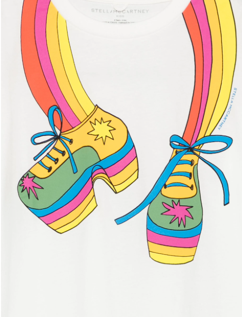 Questa T-shirt da bambina, realizzata in cotone organico di alta qualità, unisce comfort e sostenibilità. Il design elegante a manica corta è arricchito da una raffinata stampa multicolore, che ne esalta la personalità vivace. Prodotta da Stella McCartney, garantisce uno stile sofisticato e un’attenzione particolare ai dettagli.