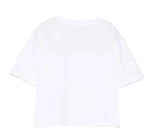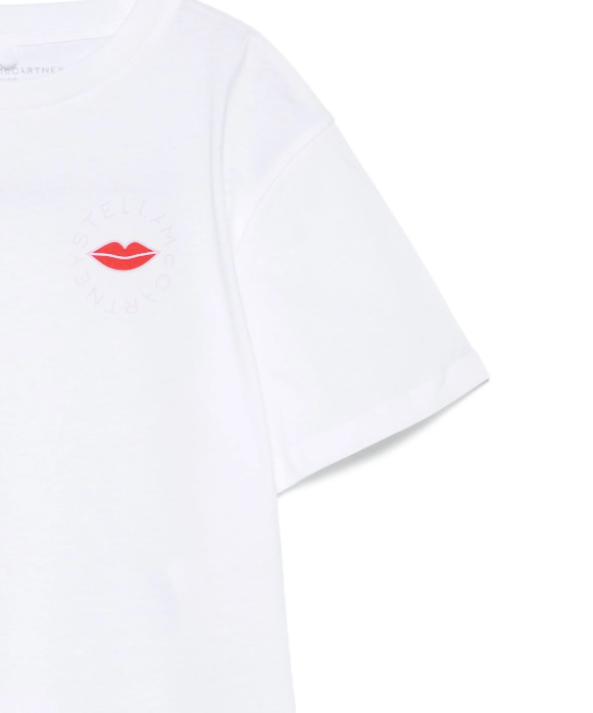 Questa T-shirt da bambina in cotone firmata Stella McCartney unisce stile e comfort con un design crop dal taglio quadrato e maniche corte. Il dettaglio distintivo del logo e la stampa a forma di bacio aggiungono un tocco di eleganza giocosa, perfetta per un look moderno e raffinato.