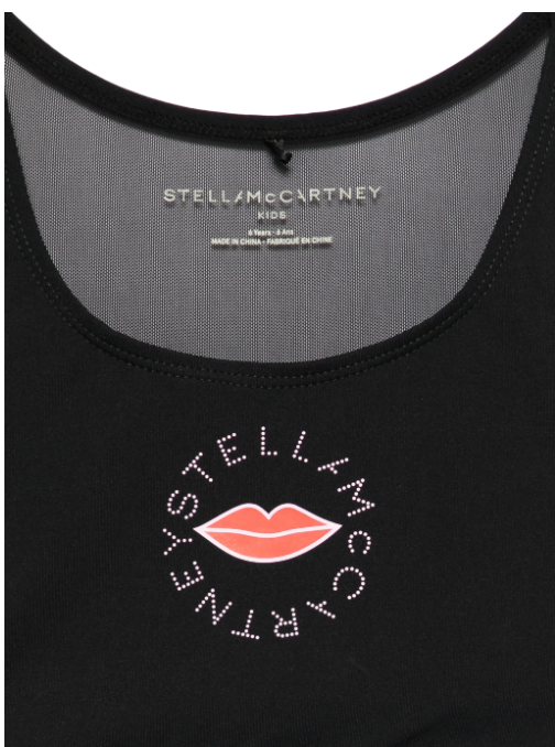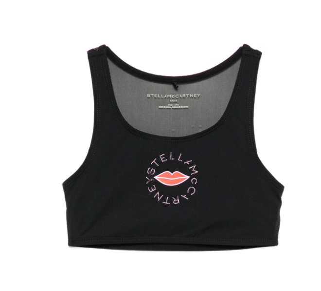 Il top da bambina in lycra presenta un design sportivo crop a giromanica, arricchito da uno scollo sul retro che ne esalta la silhouette. La stampa frontale con un delicato motivo a bacio, circondato dal logo Stella McCartney, aggiunge un'eleganza discreta ma distintiva. Un pezzo sofisticato pensato per unire funzionalità e stile contemporaneo.