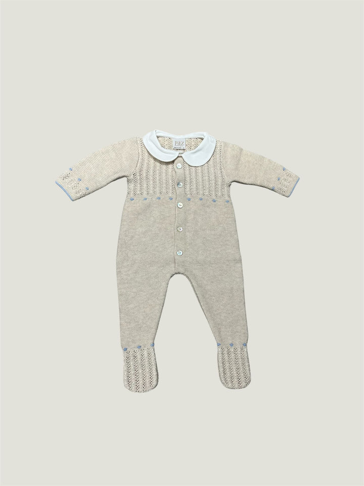 La tutina ALEGRIA unisce la morbidezza del cotone al pregio del cashmere, lavorata a maglia per garantire comfort e traspirabilità al neonato. Il colletto Peter Pan e i delicati pois azzurri aggiungono un tocco di eleganza, mentre l’abbottonatura frontale con bottoni in madreperla facilita la vestizione. Realizzata dall’azienda spagnola PAZ RODRIGUEZ, questa tutina è pensata per offrire qualità e stile fin dai primi giorni di vita.