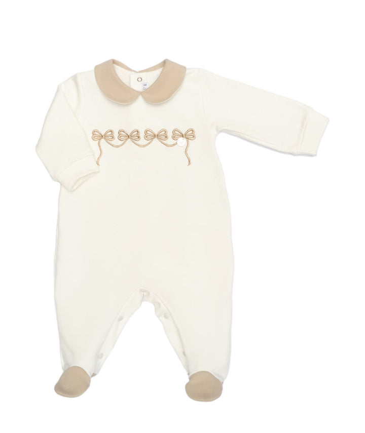 Questa tutina da neonata, realizzata in caldo cotone, garantisce comfort e morbidezza sulla pelle delicata del bambino. Il colletto alla Peter Pan aggiunge un tocco di eleganza classica, mentre il dettaglio di un tris di fiocchi ricamati al centro valorizza il design con raffinata semplicità. Un capo firmato BARCELLINO, sinonimo di qualità artigianale e cura dei dettagli.