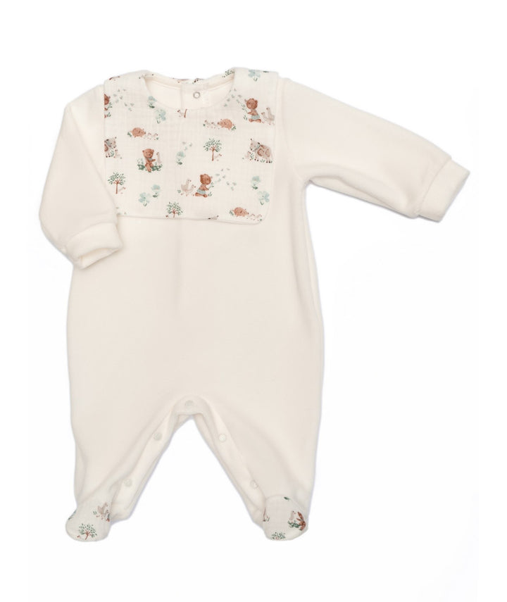 Realizzata in morbida ciniglia, la tutina DAPHNE offre comfort e calore ideali per l’uscita clinica del neonato. Il design con maniche lunghe garantisce una copertura ottimale, mentre i piedini in mussola di cotone con una raffinata stampa abbinata al bavero quadrato aggiungono un tocco di eleganza. Un capo firmato BARCELLINO, pensato per vestire con delicatezza e qualità i primi momenti di vita.