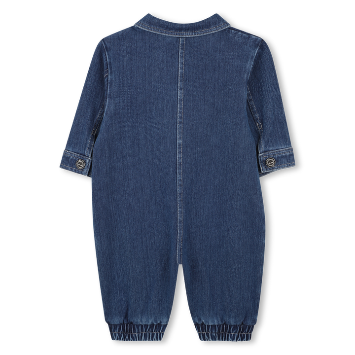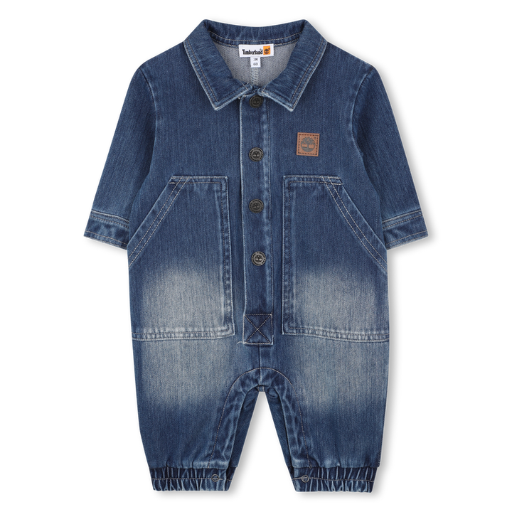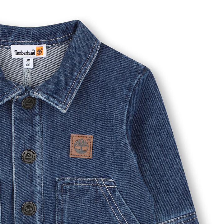La tutina per neonato TIMBERLAND in morbida maglia effetto denim unisce stile e praticità. Con maniche lunghe e bottoni a pressione sul davanti e al cavallo, facilita il cambio e garantisce comfort. Le tasche applicate e il logo discreto aggiungono un tocco moderno, ideale per accompagnare i piccoli nelle loro prime avventure quotidiane con eleganza e funzionalità.