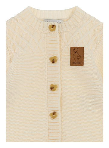 Questa tutina da neonato unisex combina eleganza e comfort grazie alla morbida lana lavorata a maglia con un raffinato motivo intrecciato. L’abbottonatura frontale, impreziosita da bottoni a forma di orsetto, unisce praticità e stile, mentre il dettaglio jacron con il logo MOSCHINO sul petto aggiunge un tocco distintivo e sofisticato, perfetto per i piccoli con gusto.